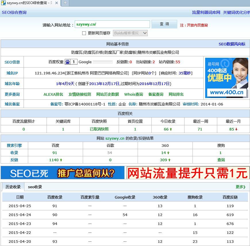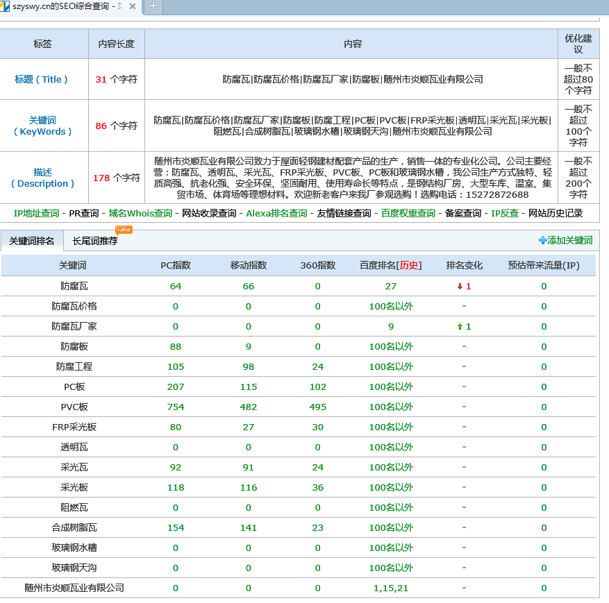 小編在這隨州市炎順瓦業(yè)有限公司防腐瓦企業(yè)從事網(wǎng)絡(luò)運(yùn)營已經(jīng)超過一個月了,從開始什么都不懂,到現(xiàn)在什么都懂了。今天一早,我用站長工具查詢http://szyswy.cn網(wǎng)站關(guān)鍵詞防腐瓦廠家的排名,驚奇的發(fā)現(xiàn),哇!防腐瓦廠家關(guān)鍵詞排名竟然提升到第九位了,防腐瓦關(guān)鍵詞排名26名了。這一個多月,小編每天更新網(wǎng)站的內(nèi)容不斷發(fā)帖子,小編的不懈努力之下,排名終于有了起色。從之前的100名以外上升到第9名,萬萬沒想到百度權(quán)重從0升到1,這讓小編感到只有付出努力才能有收獲。其實,小編覺得,網(wǎng)站不是每天更新的內(nèi)容越多,網(wǎng)站排名就越好的。網(wǎng)站排名怎么樣才能靠前,首先,更新的內(nèi)容要高質(zhì)量,能吸引訪客來閱讀,最好是原創(chuàng)真實有意義的文章,多發(fā)帖子,每天更新東西要新穎,看百度收不收錄,收錄多的話排名就越容易靠前。對于網(wǎng)絡(luò)運(yùn)營,小編不是很懂,但是小編知道,每天用心寫東西,不用百度推廣照樣靠前排名,一樣能讓企業(yè)網(wǎng)站搜索關(guān)鍵詞靠前,網(wǎng)站優(yōu)化是個漫長工作,想要弄清楚摸透,必須鉆研學(xué)習(xí)SEO,所以,從最基本的優(yōu)化網(wǎng)站開始,一點一滴積累經(jīng)驗是很關(guān)鍵的。作為網(wǎng)絡(luò)專員,看見企業(yè)的網(wǎng)站排名靠前,還是很欣慰的,每天優(yōu)化網(wǎng)站讓小編覺得是件有意義的事情,而不是單單的因為是工作而去做。本網(wǎng)站文章為隨州市炎順瓦業(yè)有限公司版權(quán)所有,未經(jīng)同意,不得轉(zhuǎn)載,否則追究其法律責(zé)任的哦!隨州市炎順瓦業(yè)有限公司專業(yè)生frp采光瓦,FRP防腐瓦,frp阻燃瓦,frp平板,PVC防腐瓦,PC瓦,玻璃鋼水槽等等屋面建材,歡迎新老客戶前來選購。